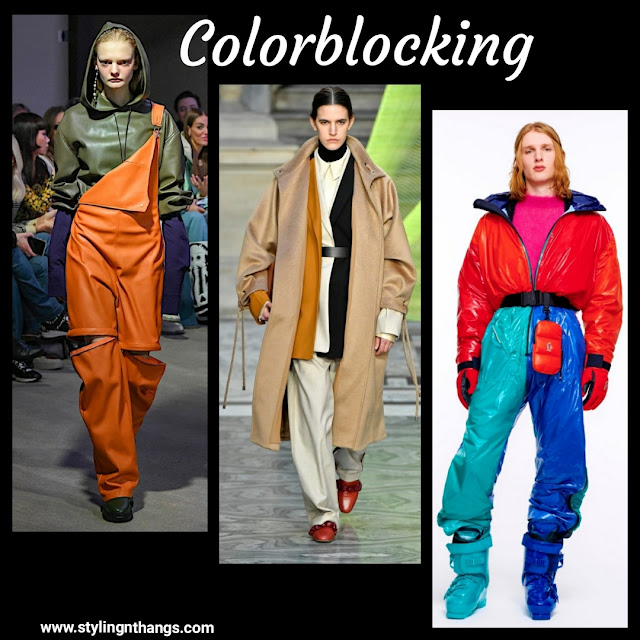 Colorblocking: Colorblocking has been an reoccurring trend for a few seasons now. This fall two tone pants (like Moncler photo far right above) have been presented, in addition to styling separate solid colors pieces together.