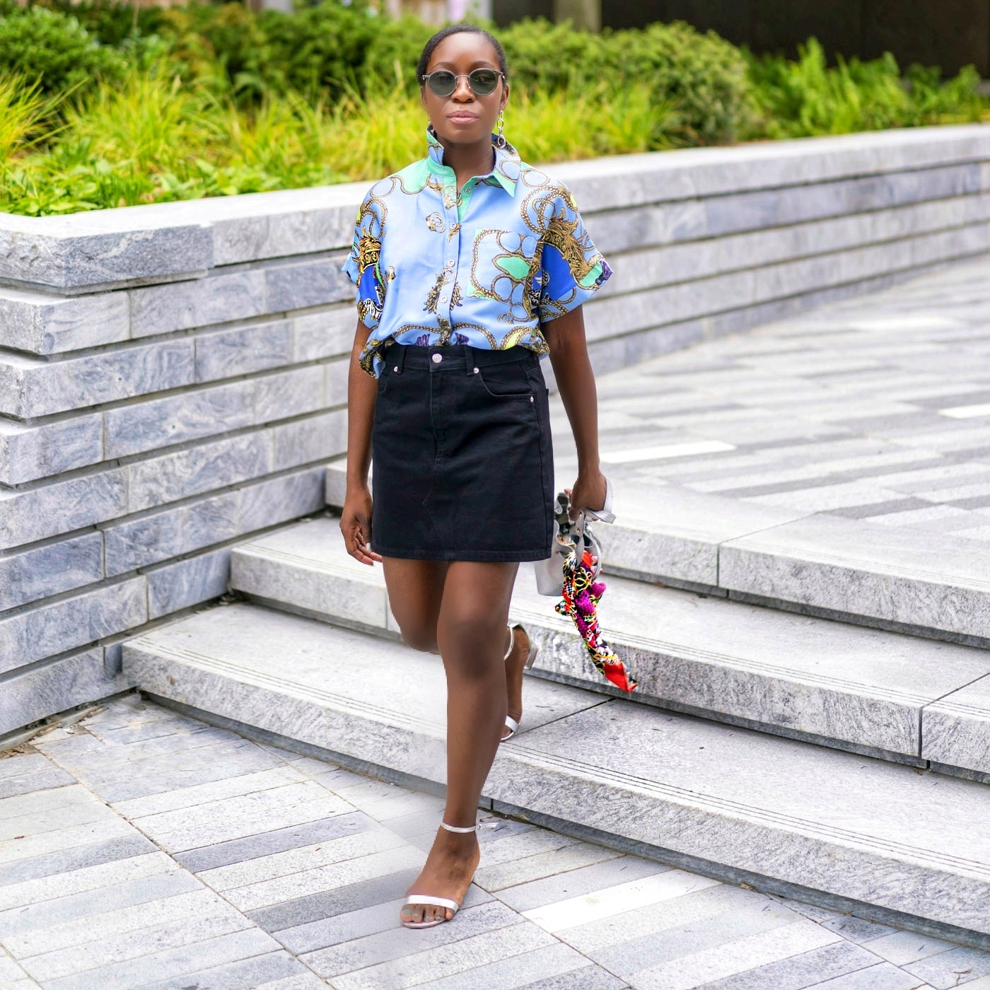 I remixed this runway look wearing a River Island blue baroque printed shirt, Mansur Gavriel silver mini bag, Aldo’s sandal, Moncler shades, and a Topshop printed scarf.